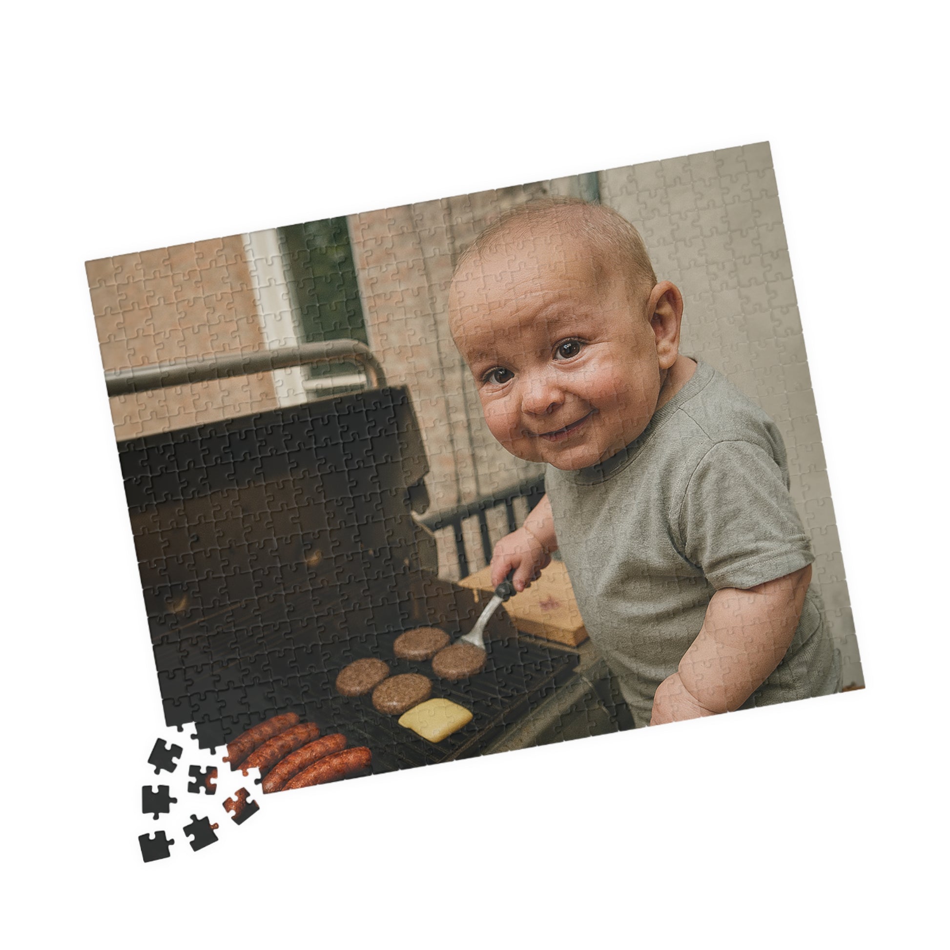 Get ready to piece together the most chaotic backyard BBQ ever—featuring Baby Chuck Schumer at the grill, confidently flipping raw hamburger patties with cheese already melting into... well, whatever this is. This puzzle captures the ultimate 'government efficiency' moment: raw meat, processed cheese, and a side of legislative grill skills. Perfect for anyone who loves politics, satire, and the art of questionable culinary decisions.