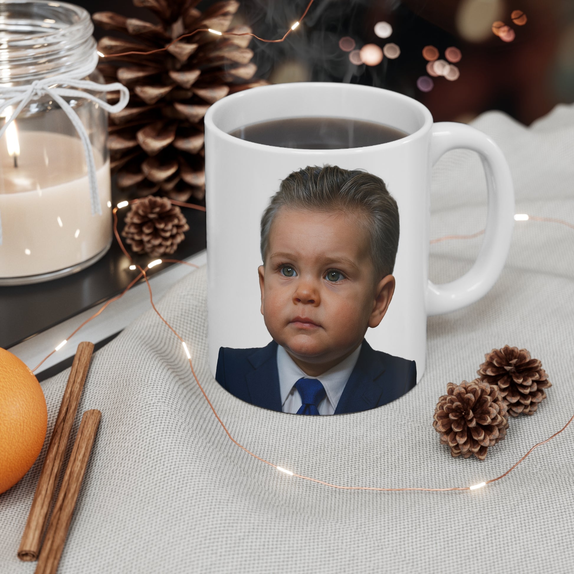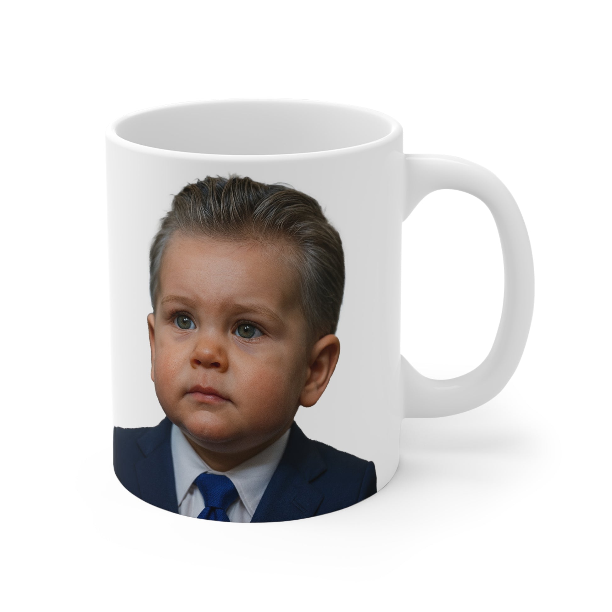 This mug? It’s not just ceramic — it’s a vessel of vision. Imagine me, baby-faced but still perfectly coiffed, looking back at you every morning as you sip your oat milk latte. That’s leadership, folks. That’s stability. That’s me, captured in glossy ceramic glory.
