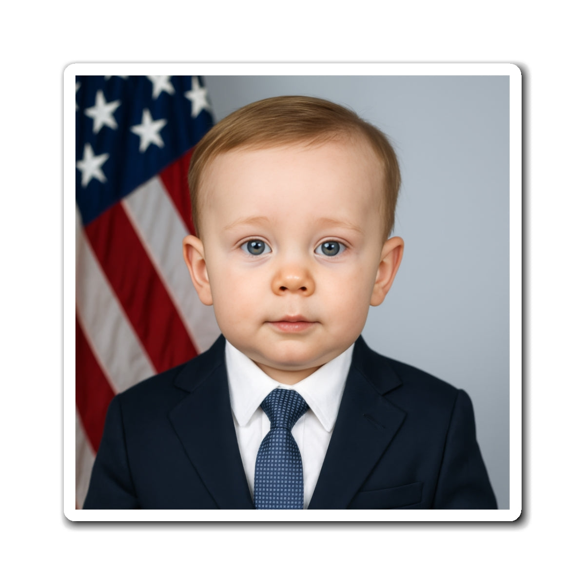 Your fridge just became the calmest command center in town. This cut-out magnet clings with measured resolve, broadcasting “steady hand” every time you reach for leftovers or launch a pudding surge. The gloss finish reflects disciplined optimism—and the baby tie? That’s bipartisan adorable.