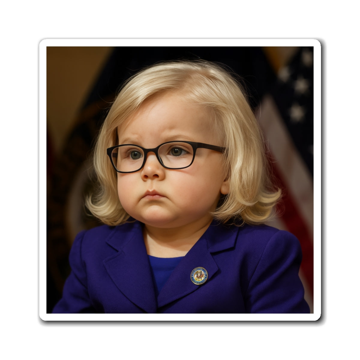 Your refrigerator becomes a little rule-of-law outpost. This cut-out magnet grips like principle and shines like a straight answer. Baby Liz watches over leftovers and to-do lists with frontier calm: measure twice, speak once, keep receipts.