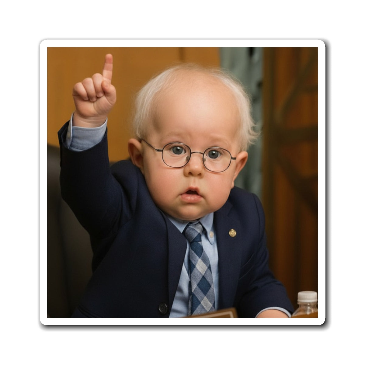 This magnet will not be bought. It will not be sold. It will be stuck—to your fridge, your locker, and the metallic heart of America. Baby Bernie clings with the tenacity of a filibuster against corporate greed, guarding your leftovers like a union steward.