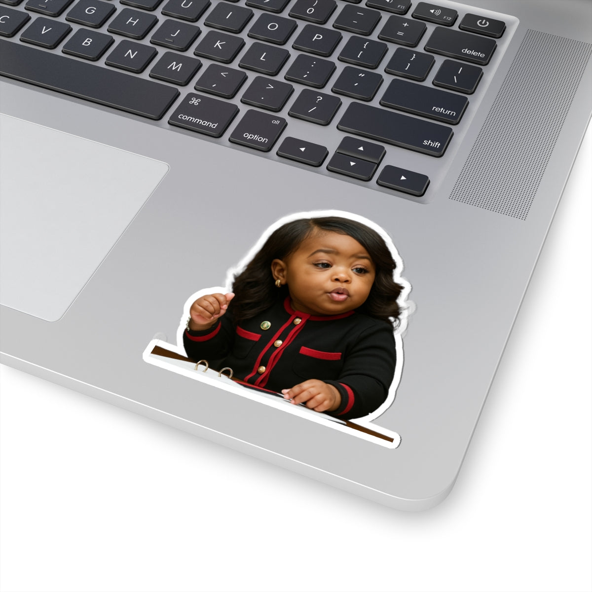 Stick it, flip it, legislate it. Baby Jasmine Crockett isn’t here to sugarcoat — she’s here to annotate. With her signature side-eye and an itty-bitty onesie to match, this kiss-cut sticker brings big energy to your smallest surfaces. Whether you’re slapping it on your laptop or your least favorite senator’s bumper, it’s all facts — no fluff.