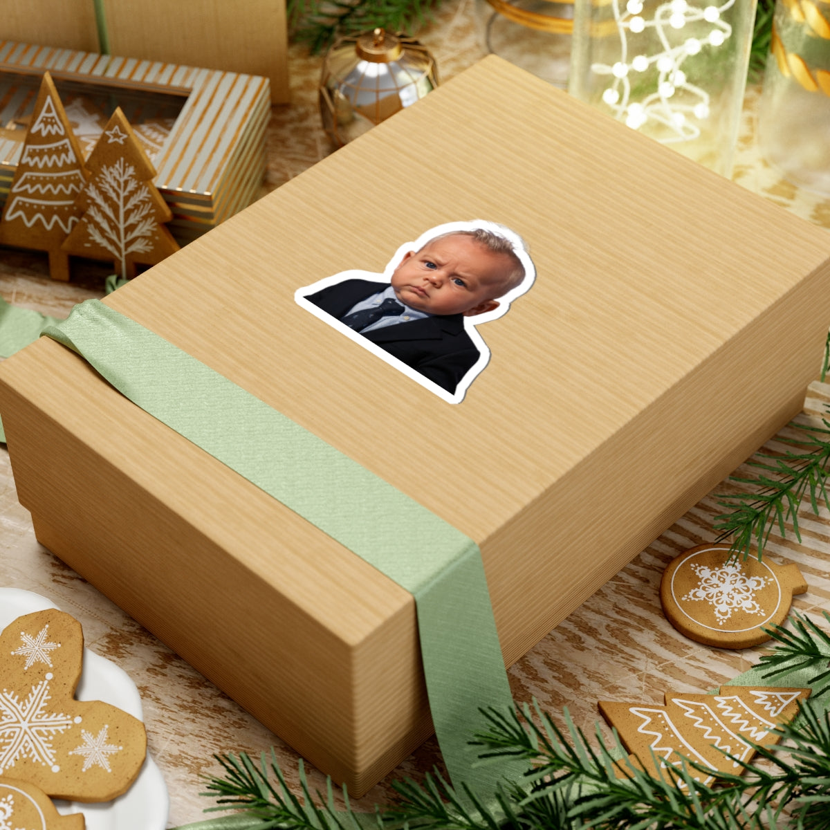 Stick this on your bumper, your water bottle, or the back of a pharmaceutical rep’s laptop. This kiss-cut crusader features my baby self in a full suit, staring into your soul and gently questioning your life choices. I might be the size of a Build-A-Bear, but I’ve got questions—and they start with, “Who authorized this juice box?”
