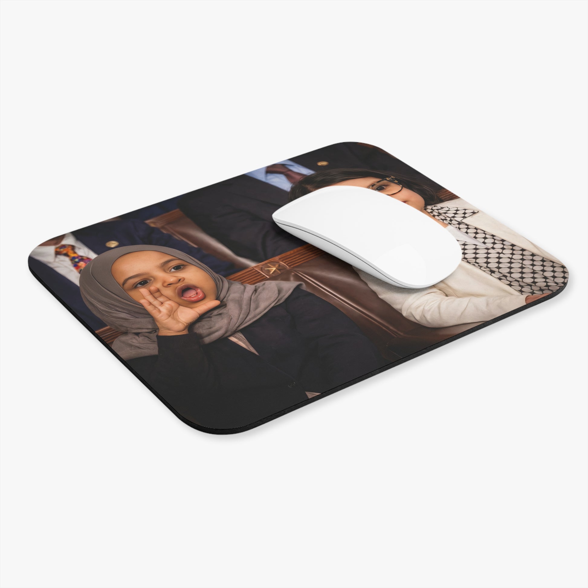 This is the mouse pad for anyone who hears a flashy line and immediately asks, “Source?” You’ve got a full State of the Union scene on your desk—complete with two tiny members of Congress doing what polite society calls “interrupting” and democracy calls “oversight.”