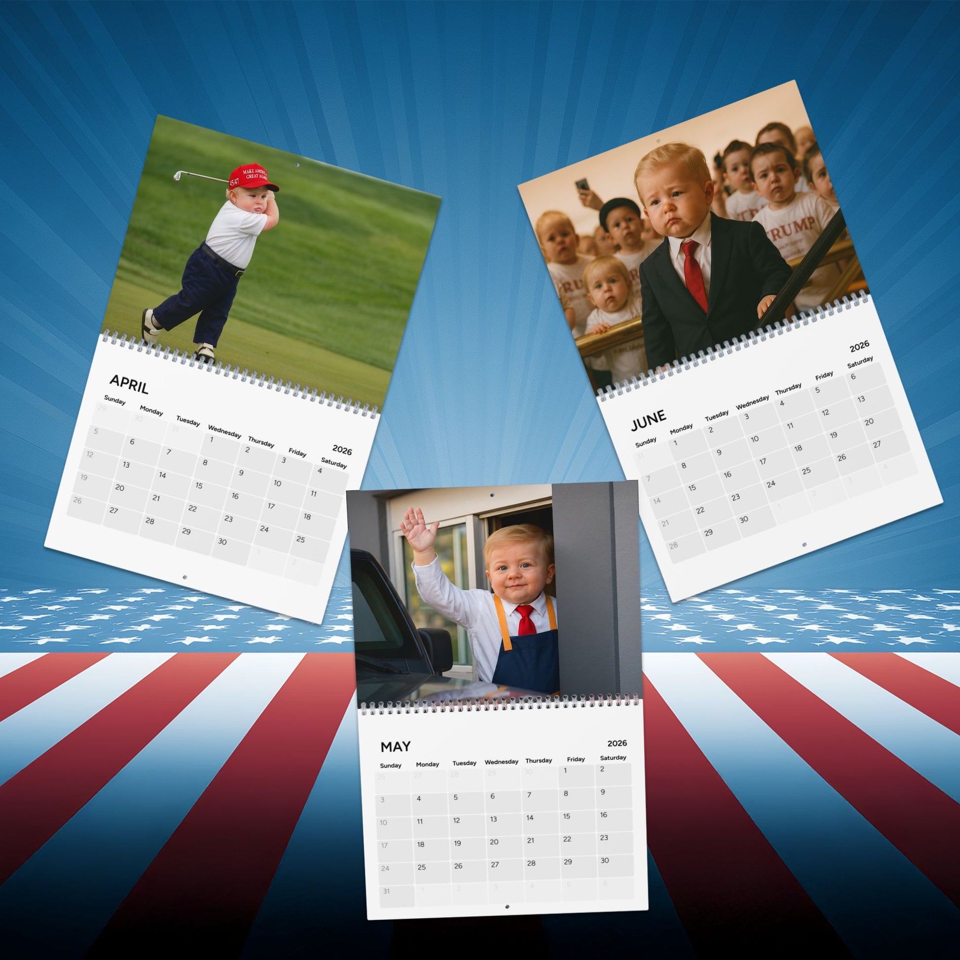 Home, with scenes so classy you’ll want to hang two copies—one for the office, one for the gold room. Each month features a brand-new, perfectly lit, extremely presidential diaper-power moment: jetway struts, rally poses, tiny tie adjustments…the works. Collectible captions, bold colors, and that unmistakable aura of victory? We’ve got it all.
